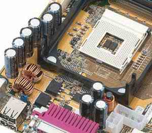(图为主板CPU插槽部分的铝电解电容)